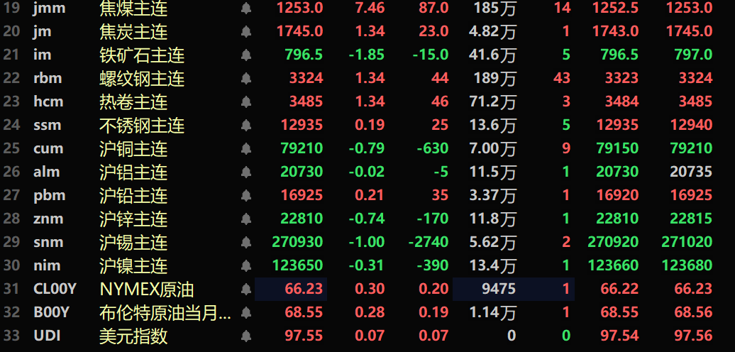 黑色系多飘红,铁矿跌1.85%,螺纹涨1.34%,热卷涨1.34。不锈钢涨0.19%。双焦方面:焦煤主力合约延续前6个交易日的涨势继续大涨7.46%,焦炭期货主力合约涨1.34%。