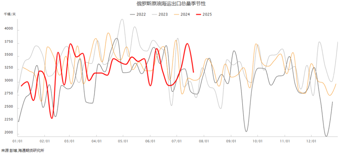 根据俄罗斯官方数据,2024年俄罗斯石油出口量为2.4亿吨(约合460万桶/日)。其中,原油出口占比约80%(1.92亿吨),成品油出口占比20%(0.48亿吨)。数据显示,2024年俄罗斯原油产量为5.16亿吨(约990万桶/日),高于欧佩克+减产配额,国内炼油厂亏损导致部分产能闲置,更多原油被迫出口。俄罗斯原油出口占全球原油贸易量的12%,仍为全球第二大原油出口国。标普全球等机构综合港口数据和船运追踪,认为2024年俄罗斯海运原油出口量为420万-450万桶/日,总出口量(含管道)约为460万-480万桶/日。