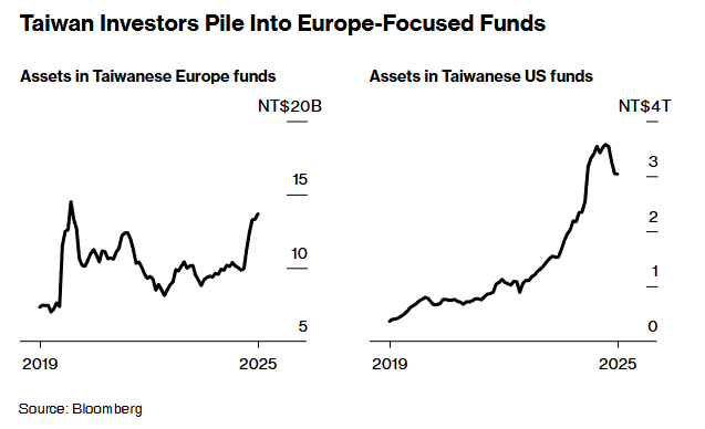 在全球资金正逐步远离美元资产的时候,中国台湾投资者也不例外——他们正在重新评估长期以来对美元资产的偏好,并将目光投向欧洲。数据显示,截至6月底,持有欧洲资产的台湾基金近期吸引大量投资,总资产达到新台币137亿元(约合4.63亿美元),为2019年以来的最高水平。此外,根据台湾证券投资信托暨顾问商业同业公会(SITCA)的数据,2025年上半年,台湾投资者还向境外以欧洲为重点的基金投入了新台币141亿元,创下自2021年以来最大的半年投资规模。