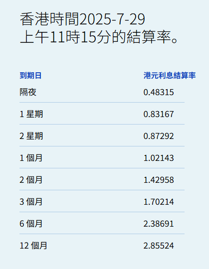 7月29日,港元拆息普遍向下,隔夜息报0.48315%,跌8.626基点,与楼按相关的一个月拆息报1.02143%,是7月25日后最低,跌0.178基点。一周及两周拆息上升,分别报0.83167%、0.87292%。