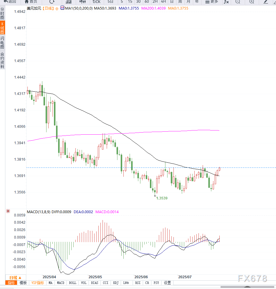 下方支撑则位于1.3700与1.3650。前者为短期回调的第一防线,若跌破可能测试九日均线支撑,进而改变当前强势格局。