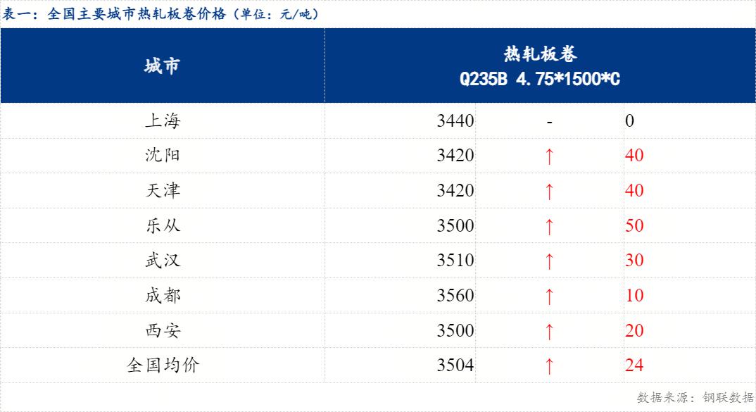 截止发稿时4.75热轧板卷全国均价3504元/吨,较上一交易日上涨24元/吨。其中主要城市价格为上海3440元/吨,沈阳3420元/吨,天津3420元/吨,乐从3500元/吨,武汉3510元/吨,成都3560元/吨,西安3500元/吨。