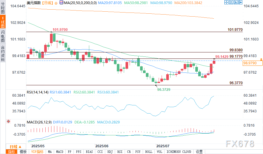 此次突破确认了短期趋势反转,目标指向99.177至99.838之间的关键回撤区间。随着美元指数攀升至98.950上方,6月23日高点99.421和5月29日峰值100.540现已成为潜在上行目标。