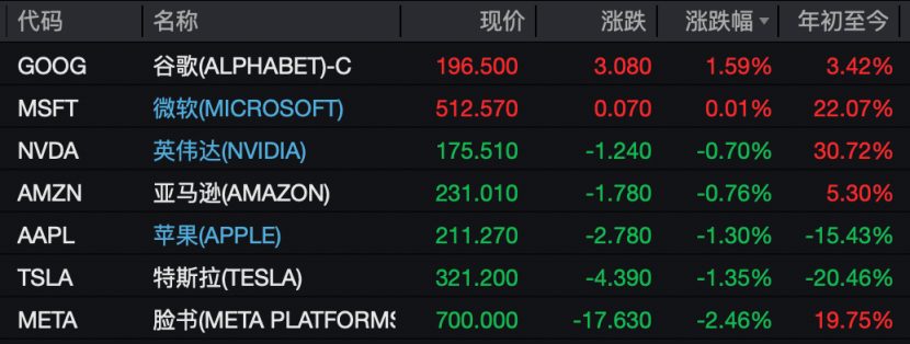 作为美股市场最重要的一类板块,大型科技股多数下跌,其中Meta跌逾2%,特斯拉、苹果跌逾1%,亚马逊跌0.76%,英伟达跌0.7%,微软涨0.01%,谷歌涨逾1%。