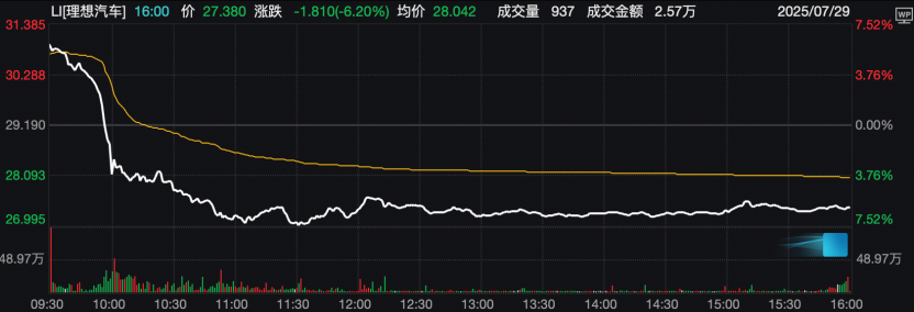 理想汽车美股盘中剧烈波动,盘初涨幅一度超6%,随后跳水转跌,截至收盘,理想汽车美股跌逾6%。