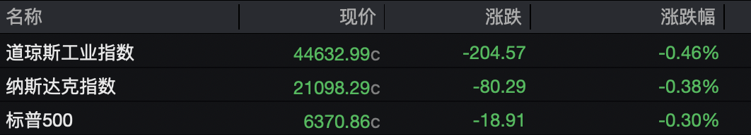 当地时间7月29日(周二),美国股市三大股指全线收跌,截至收盘,道琼斯工业指数跌0.46%,报44632.99点,标准普尔500指数跌0.3%,报6370.86点,纳斯达克综合指数跌0.38%,报21098.29点。