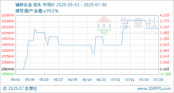 7月30日,生意社镝铁合金基准价为1610000.00元/吨,与本月初(1590000.00元/吨)相比,上涨了1.26%。