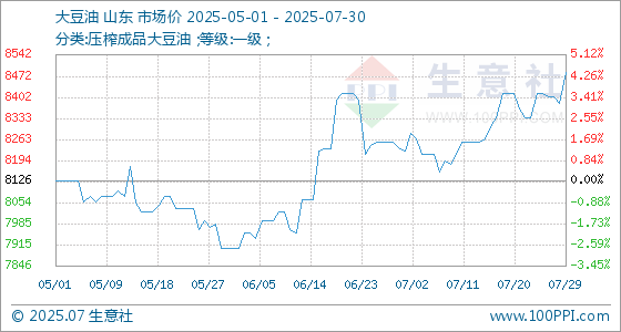 7月30日,生意社大豆油基准价为8484.00元/吨,与本月初(8234.00元/吨)相比,上涨了3.04%。