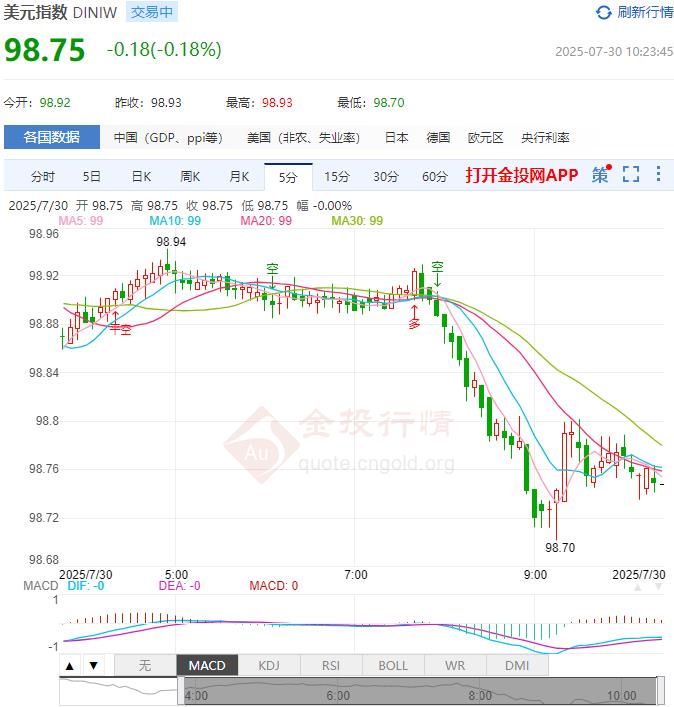 北京时间周三(7月30日)亚盘开盘,美元指数交投于98.76附近,主要非美货币对美元涨跌不一,欧元/美元交投于1.1564附近,英镑/美元徘徊在1.3359附近,澳元/美元徘徊在0.6518附近,美元/加元徘徊在1.3763附近,美元/日元暂处148.06附近。今日基本面关注13:30 法国第二季度GDP年率初值。