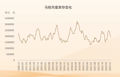 对于这两个位于东南亚的棕榈油主产国而言,棕油产量呈现明显的季节性规律。具体表现为:通常每年的9月至11月为丰产月,每年的1月至了月为低产月。在棕油出口保持正常的情况下,产量的季节性导致了库存的季节性。每年的11月至次年4月这段时间马来西亚棕榈油库存呈现季节性下滑的趋势。这个时间段内,马来西亚衍生产品交易所(BMD)的棕油期价走强,在2月份往往是年内价格高点。而每年的4月至11月,马棕油库存会呈现上升的趋势棕榈油期价也会走弱,在每年的第三季度达到年内的价格低点。