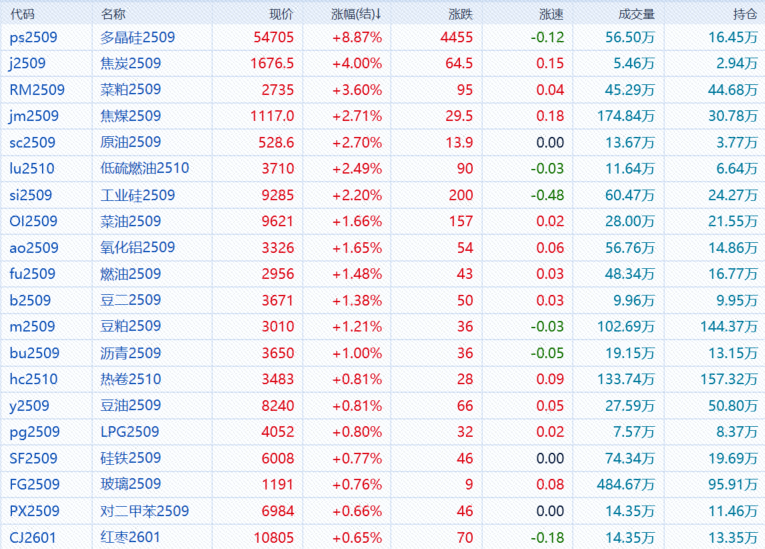 7月30日,午盘收盘,国内期货主力合约涨多跌少。多晶硅涨超8%,焦炭、菜粕涨超3%,SC原油、工业硅、焦煤、低硫燃料油(LU)涨超2%;跌幅方面,棉花、棉纱、纸浆跌超1%,白糖、20号胶跌近1%。