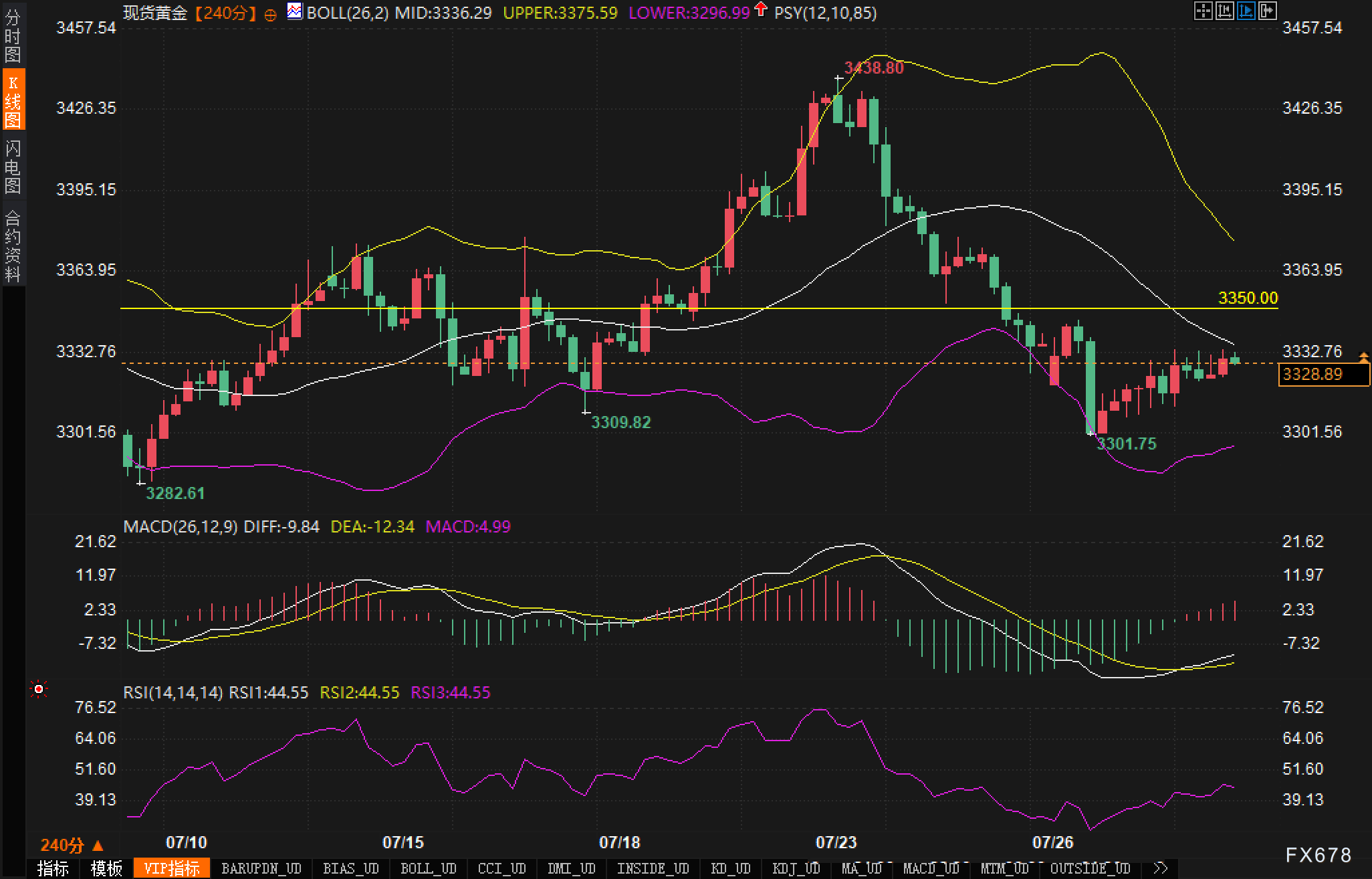 当前黄金240分钟K线图呈现出典型的整理形态。布林带中轨(3336.29)附近成为当前价格的重要均衡区域,价格在快速下探至3301.75后形成短线企稳,随后维持在中下轨之间震荡修复。