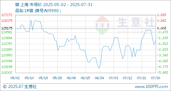 7月31日,生意社镍基准价为123400.00元/吨,与本月初(122400.00元/吨)相比,上涨了0.82%。