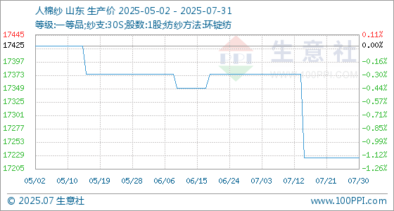 7月31日,生意社人棉纱基准价为17225.00元/吨,与本月初(17375.00元/吨)相比,下降了0.86%。