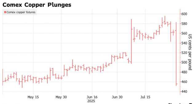 美国铜市遭遇了有史以来最大的单日跌幅,原因在于美国总统特朗普意外地宣布将对最广泛进口的铜产品豁免征收其计划中的关税,这一举动令交易员们感到震惊。白宫周三表示,从8月1日起,对来自中国的半成品铜制品将征收50%的关税,但对精炼金属的进口则不会征收此类关税。