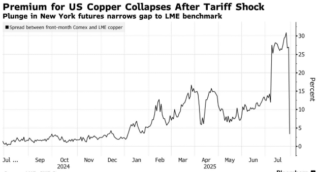 这一决定是特朗普给铜市带来的最新一次重大冲击。今年年初,当特朗普首次提及可能征收关税时,这导致美国铜价相对于全球其他地区大幅上涨,并引发了各方争相将铜运往美国以避开关税的热潮,从而为一些全球最大的金属交易商带来了丰厚利润。