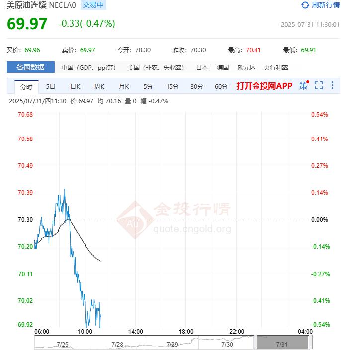 截止7月31日上午11点30分,WTI原油现报69.97美元/桶,跌幅0.47%;布伦特原油现报72.38美元/桶,跌幅0.51%。