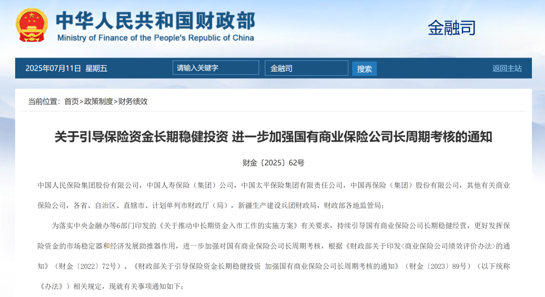 7月11日,财政部印发《关于引导保险资金长期稳健投资进一步加强国有商业保险公司长周期考核的通知》(下称《通知》),明确国有商业保险公司全面建立三年以上长周期考核机制,同时要求国有商业保险公司提高资产负债管理水平,注重稳健经营,增强投资管理能力。