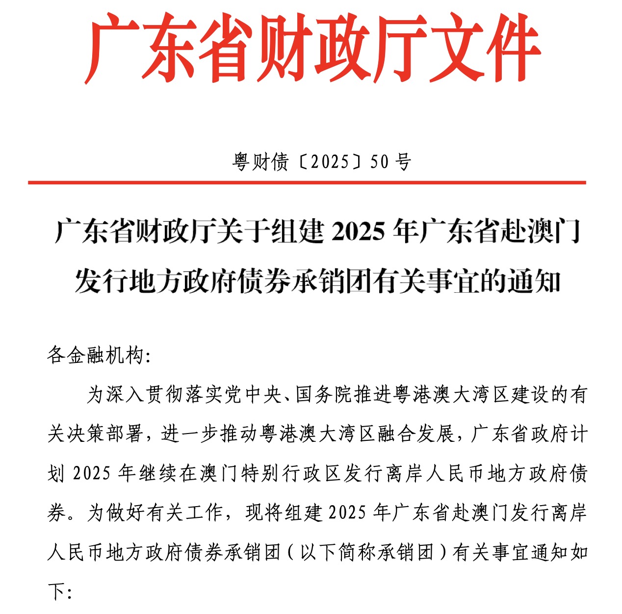 同日,广东省财政厅也发布了关于组建2025年广东省赴香港发行地方政府债券承销团有关事宜的通知,公告显示,广东省政府计划2025年继续在香港特别行政区发行离岸人民币地方政府债券,规模不超过75亿元,期限不超过10年期。