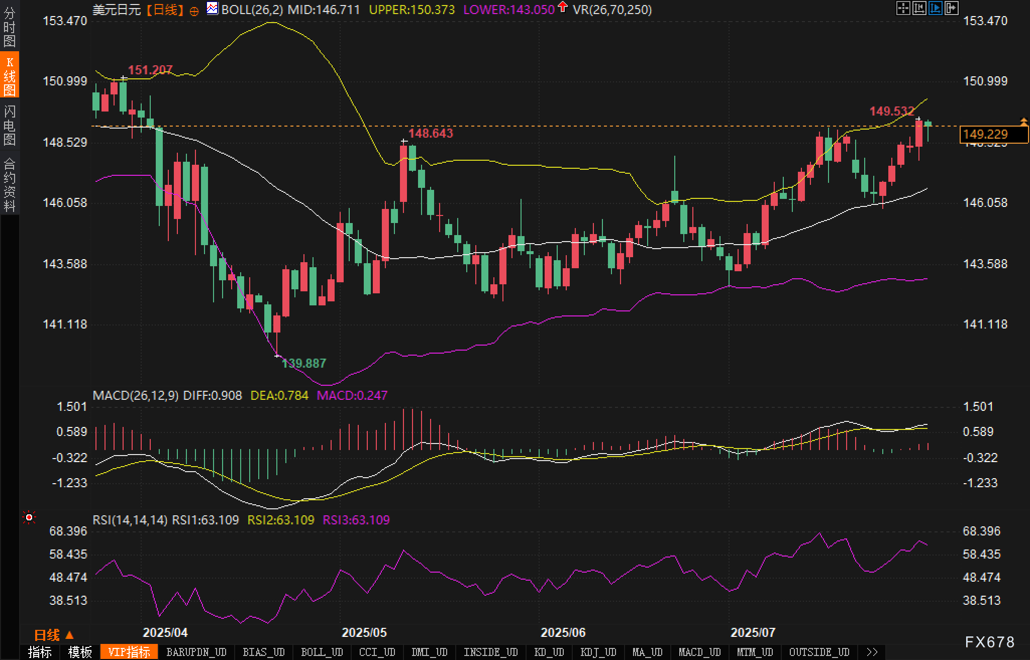 从日线图观察,美元兑日元汇价目前位于布林带上轨(150.373)下方,日内一度逼近高点149.532,形成短线阻力压制。从K线形态来看,连续多根阳线已将价格推升至前高附近,短线涨势趋于过热,逼近技术性超买区域。