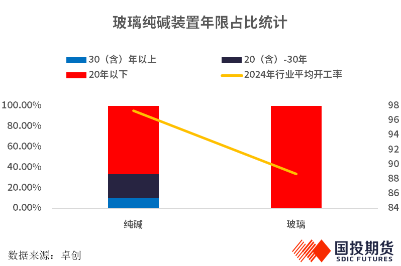 针对以上政策,我们对玻璃和纯碱行业进行了梳理,玻璃行业装置年限都是20年以下,老旧装置影响不大,但是会从能耗方面对产能进行相应的控制,今天生态环境部为防治大气污染,改善大气环境质量,推动玻璃、矿物棉工业大气污染防治技术提升,公开征求《玻璃工业大气污染防治可行技术指南(征求意见稿)》,未来玻璃行业可能会从能耗方面淘汰落后产能,重点聚焦在煤制气以及石油焦的产线,相对天然气,这两者排放的颗粒物以及SO2以及NOx更高,而目前煤制气和石油焦产线占比在40%左右。如果未来需要对高耗能的产线进行调整,一方面可能会引起产能短期关停,另外燃料的改造,会助推成本进一步提升。