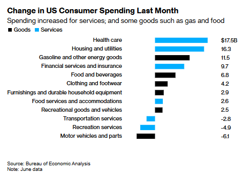 这些数据显示,消费者支出已连续几个季度呈现疫情以来最疲软增长。6月支出回升主要得益于非耐用品消费反弹,而耐用品购买量连续三个月下滑(创2021年以来最长连降),服务支出增长乏力,显示可自由支配开支萎靡。