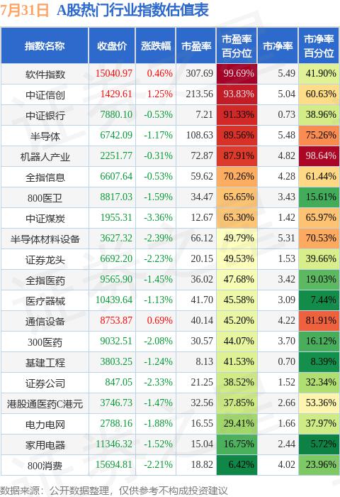 热门行业指数方面,软件指数的市盈率百分位较高,为99.69%。而800消费的市盈率百分位较低,为6.42%。