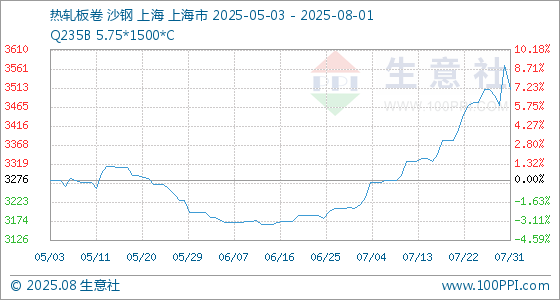 8月1日,生意社热轧板卷基准价为3510.00元/吨,与上月初(3210.00元/吨)相比,上涨了9.35%。