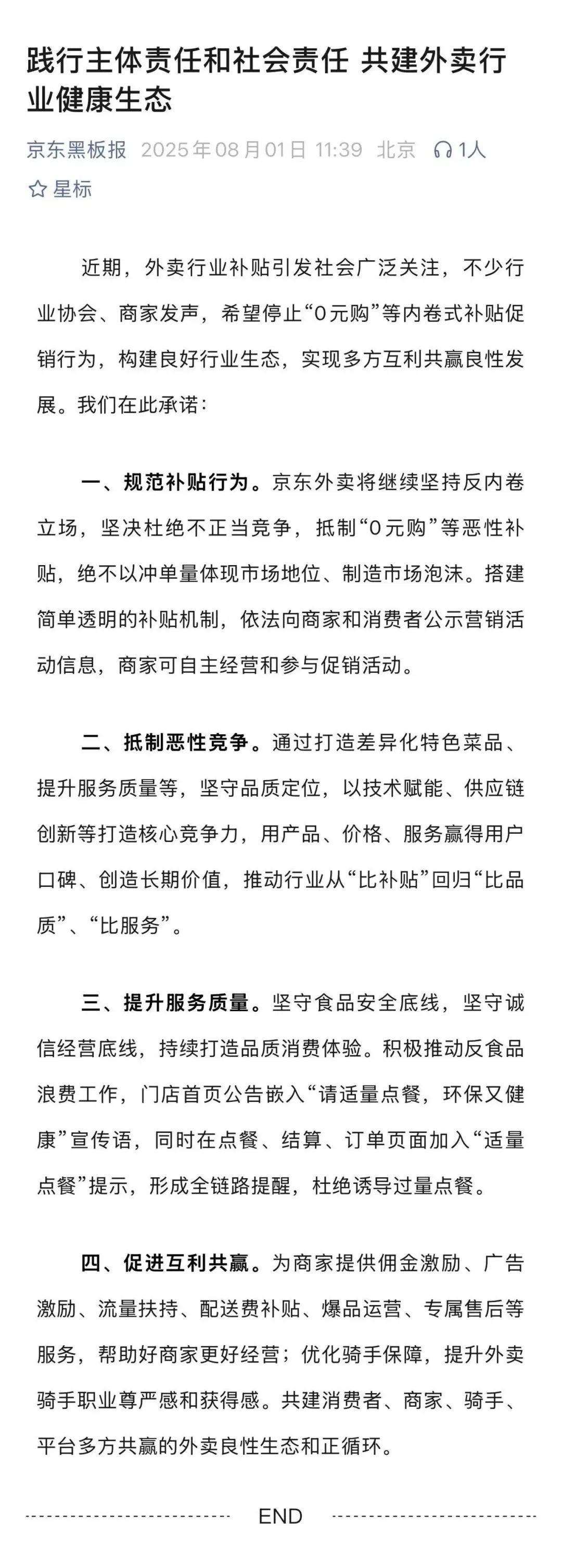 1日午间,京东黑板报发布的《践行主体责任和社会责任共建外卖行业健康生态》中称,近期,外卖行业补贴引发社会广泛关注,不少行业协会、商家发声,希望停止“0元购”等内卷式补贴促销行为,构建良好行业生态,实现多方互利共赢良性发展。京东承诺,京东外卖将继续坚持反内卷立场,坚决杜绝不正当竞争,抵制“0元购”等恶性补贴。