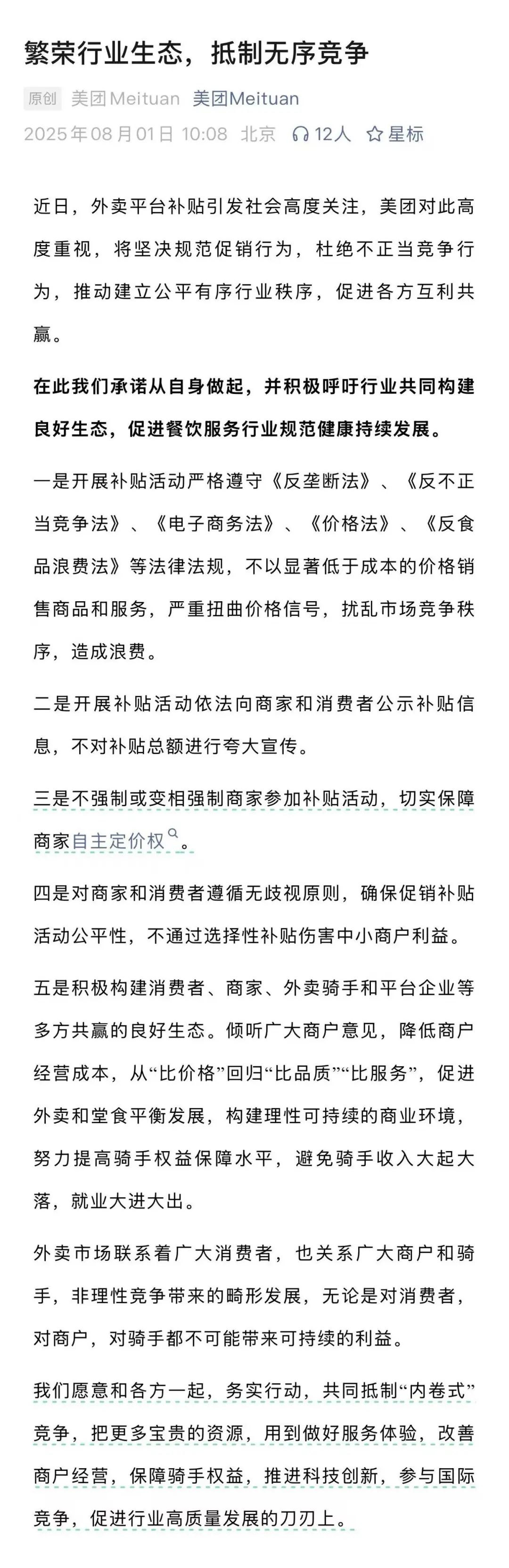 美团发文《繁荣行业生态,抵制无序竞争》,称外卖平台补贴引发社会高度关注,美团对此高度重视,将坚决规范促销行为,杜绝不正当竞争行为,推动建立公平有序行业秩序,促进各方互利共赢。