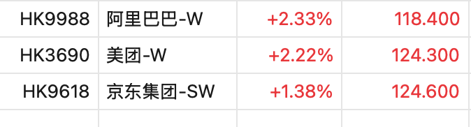8月1日,美团、阿里巴巴盘中拉升,一度大涨超3%,截至发稿,美团涨幅回落至2.22%,阿里巴巴涨2.33%,京东集团涨1.38%。