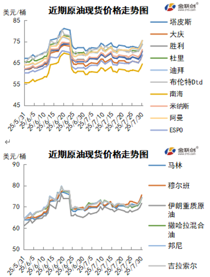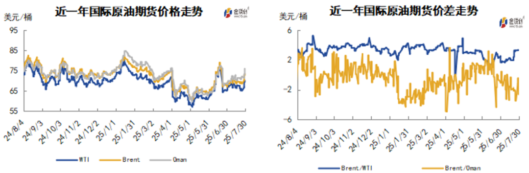 本周(7.24-7.30),国际原油价格整体呈现震荡上行的走势,周度均价环比上涨。WTI均价67.42美元/桶,较前一周上涨0.71美元/桶,或1.07%。周内,对油价起到支撑的因素有:美欧达成贸易协议,美国提前俄乌谈判期限,美国因能源进口问题制裁印度,俄罗斯管制俄罗斯港口船只。