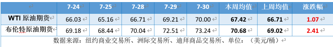 本周(7.24-7.30),国际原油整体呈现震荡上行的走势,周均价环比上涨。