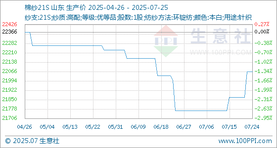 7月25日生意社棉纱21S基准价为22066.67元/吨
