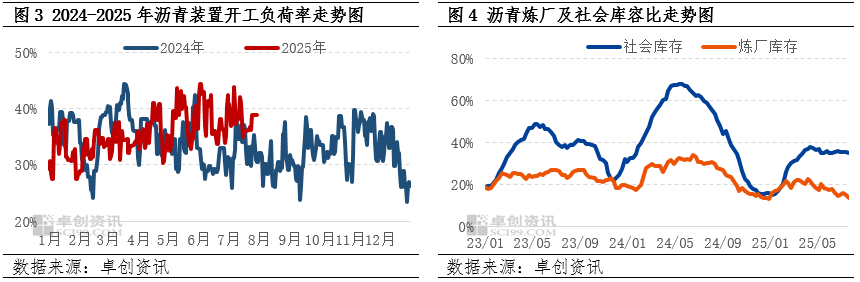 从沥青供需面来看,本月沥青装置平均开工负荷率大概为38.25%,环比下降了0.35个百分点。虽然从炼厂生产利润来看,7月份地炼沥青、石脑油、汽油价格表现偏强,且稀释沥青及马混原油价格下行,带动地方炼厂沥青生产效益改善。但是中东原油环比继续走高,导致主营炼厂沥青生产效益下滑,主营炼厂沥青装置开工负荷率降幅明显,尤其是茂名石化、镇海炼化产量降低后,缓解了南方地区供应压力,对沥青现货价格存在底部支撑。加之华东、华中大部分地区降雨明显减少,重点项目施工的稳定性得到保障,利于沥青需求的释放,7月份沥青刚性需求以稳中改善为主。因此,截至7月23日,沥青炼厂库存以及社会库存较6月底均出现小幅下降,支撑沥青现货价格上行。