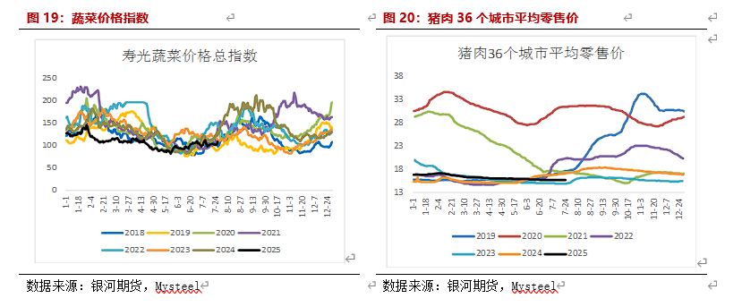 替代品:7月蔬菜价格略有上涨,猪肉价格维持低位震荡,目前均处于近些年同期低位。截至7月25日,寿光蔬菜指数为108.93;猪肉价格整体变化不大,截至7月25日价格为15.63元/公斤附近。综合来看,较低的蔬菜价格对鸡蛋的替代需求较弱;当前猪肉价格继续维持低位震荡,对鸡蛋替代需求相对有限。