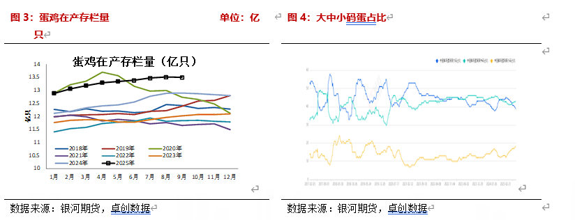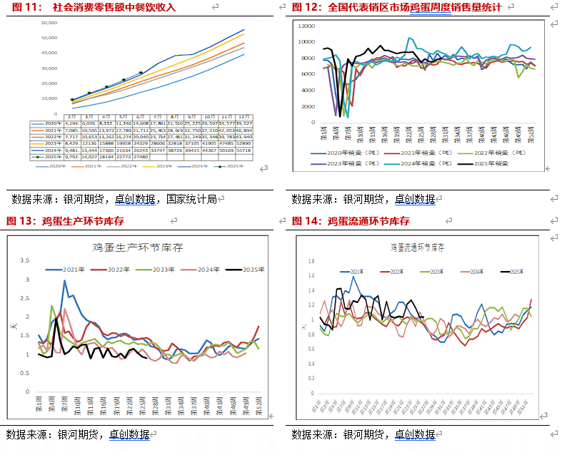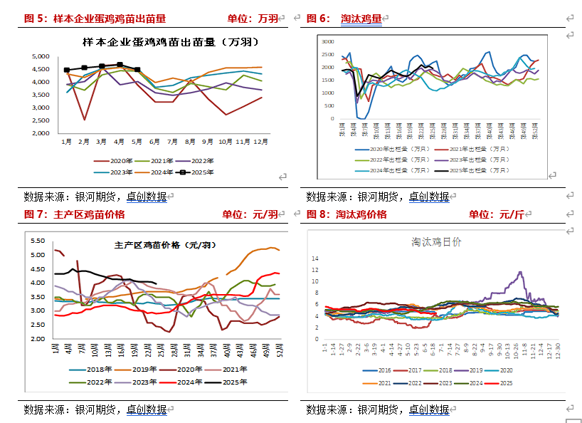 供应端:根据卓创数据6月份全国在产蛋鸡存栏量为13.4亿只,较上月增加0.06亿只,同比增加6.7%,高于之前预期。不考虑延淘和集中淘汰的情况下,根据之前的补栏数据可推测出2025年7月、8月、9月、10月在产蛋鸡存栏大致的数量为13.49亿只、13.53亿只、13.51亿只和13.43亿只。