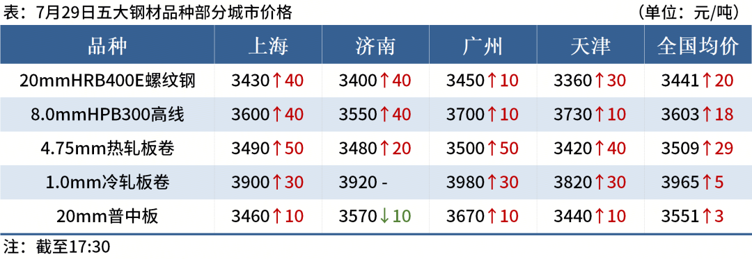 ◎7月29日,唐山迁安普方坯资源出厂含税累计上调60,报3150元/吨。