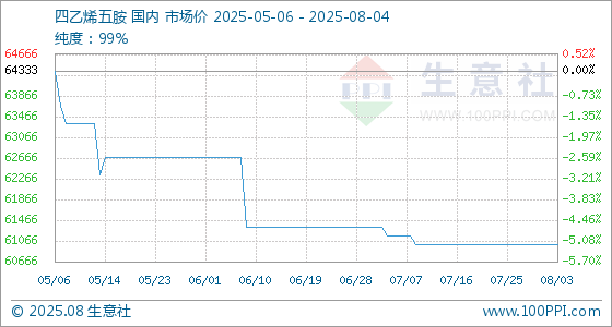 8月4日,生意社四乙烯五胺基准价为61000.00元/吨,与本月初持平。
