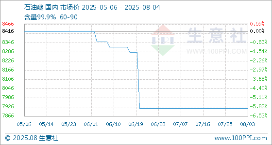 8月4日,生意社石油醚基准价为7916.67元/吨,与本月初持平。