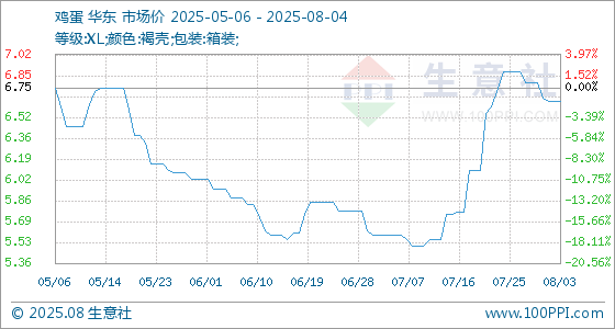8月4日,生意社鸡蛋基准价为6.65元/公斤,与本月初(6.67元/公斤)相比,下降了0.3%。
