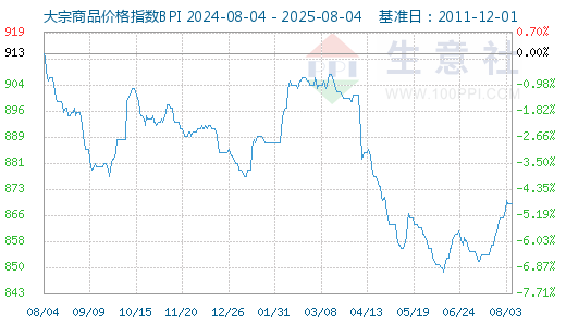 8月3日大宗商品价格指数BPI为869点,与昨日持平,较周期内最高点1343点(2021-10-19)下降了35.29%31.67%
