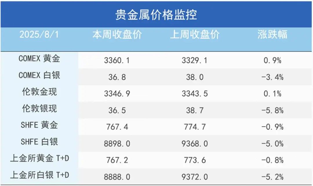 上周金价先抑后扬,银价持续回落,COMEX金银于3319-3417美元/盎司、36.2-38.5美元/盎司区间内运行。上周初美元及利率的反弹压制金价,而周五非农数据远低于市场预期,前值大幅下修,失业率小幅提升,使得市场降息预期显著回升,同时美联储理事库格勒辞职,使得美联储独立性或将再度受到质疑,美元、利率快速下挫,金价由此抬升。
