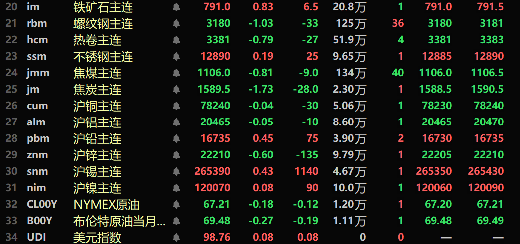 黑色系多飘绿,铁矿涨0.83%,螺纹跌1.03%,热卷跌0.79%。不锈钢涨0.19%。双焦方面:焦煤主力合约跌0.81%,焦炭主力合约跌1.73%。