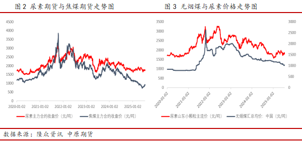 尿素产业链上游原材料主要包括煤炭和天然气等,下游消费主要用于农业需求、工业需求以及部分出口,其中农业需求包括农业直接施用和生产复合肥以后的间接施用,工业需求则用于生产脲醛树脂、三聚氰胺,以及电厂尾气脱硝和柴油机尾气的处理液等。为了解产业链上下游各指标对尿素价格的影响程度,本文选取了2020年至2025年期间相关指标的历史数据进行了相关性分析,历史数据及相关性分析结果均来源于钢联数据终端。