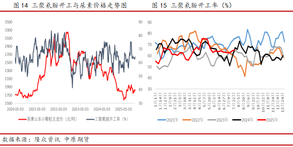 三聚氰胺作为尿素下游需求之一,也是以尿素为生产原料,生产1 吨三聚氰胺约需 3 吨尿素,因此二者价格之间存在较强的正相关关系,相关性分析结果显示尿素价格与三聚氰胺价格相关系数为0.643。此外,由于三聚氰胺全年开工表现较为平稳,因此开工率与尿素价格相关性结果相对较弱一些,相关系数仅有0.235。