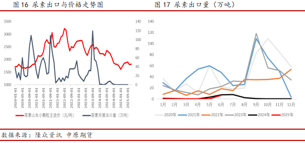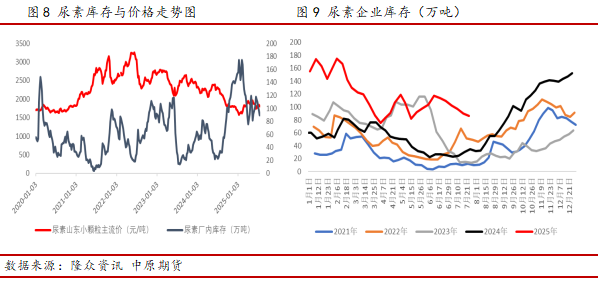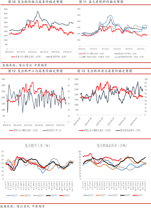 从复合肥生产季节性来看,由于复合肥主要用于农作物施用,因此其生产开工与农需季节性相关度较高,但从复合肥开工率与尿素价格相关性分析结果来看,二者之间相关系数为-0.143,表明存在较弱的负相关,可能的原因包括如果尿素等原料价格过度上涨,会导致复合肥涨价后下游跟进情况不佳,则复合肥企业利润空间可能会出现迅速收缩的情况,此时复合肥生产积极性将会降低。此外,复合肥成品库存与尿素价格相关系数为-0.305,表明存在一定的负相关,可能的传导路径为当复合肥成品库存处于较高状态时,说明此时下游拿货积极性不足,会对复合肥企业开工产生影响,进而对尿素原料采购需求将有所减弱。当前复合肥开工正处于低位逐步回升状态,预计生产高峰期为8-9月,对尿素原料采购需求也将逐步增加,但成品库存较高及下游提货积极性不足的情况仍对复合肥原料采购规模存在一定限制。