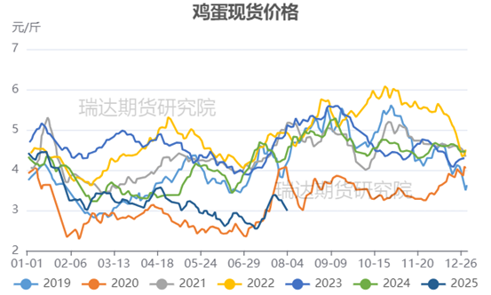 就鸡蛋全年价格的季节性规律而言,国庆和中秋节日前备货阶段,需求提升支撑下,现货价格基本自7、8月便逐步回升,并在9月来到全年最高位。但是今年来看,由于蛋鸡存栏不断突破历史新高,供应端压力也逐步加大,现货市场呈现出旺季不旺的情形。7月中旬,在价格跌至低位后低价采购情绪增加,且温度高蛋鸡产蛋率及蛋重下降,市场情绪面支撑较强,提振蛋价短暂拉升,但随着价格回涨后,市场接受程度有限,各环节避险情绪增加,叠加新开产压力较高,拖累现货价格再度下滑。截止8月4日,全国鸡蛋现货价格平均价报2991元/500千克,处于近年同期最低位,且较去年同期约低了1600元/500千克。现货市场持续低位偏弱调整,拖累近月盘面同步下滑。