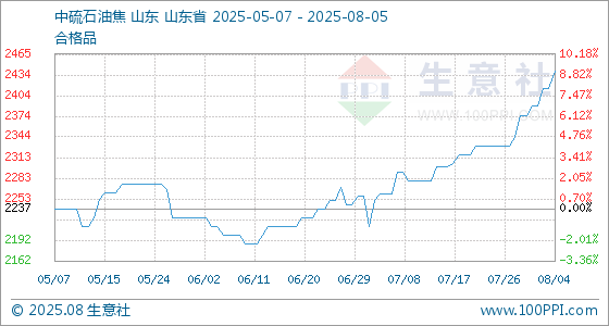 8月5日,生意社石油焦基准价为2440.00元/吨,与本月初(2390.00元/吨)相比,上涨了2.09%。
