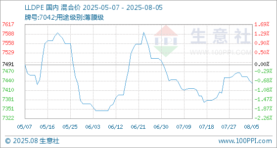 8月5日生意社LLDPE基准价为7441.67元/吨